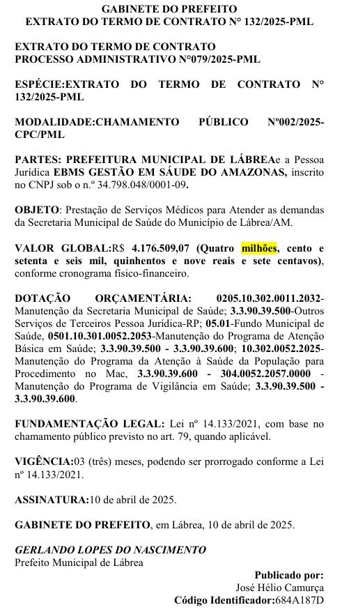 De acordo com o Diário Oficial dos Municípios (DOM), a grande beneficiária é a empresa EBMS GESTÃO EM SAÚDE DO AMAZONAS LTDA, que vai receber R$ 4.176.509,07 (quatro milhões, cento e setenta e seis mil, quinhentos e nove reais e sete centavos), para prestar serviços médicos por apenas três meses em Lábrea.