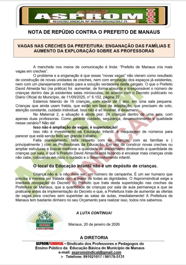 Diante do cenário, a entidade exige a revogação imediata do decreto que aumentou o quantitativo por turma, o retorno aos limites praticados anteriormente e a ampliação real da oferta de vagas, sem superlotar salas de aula. O sindicato também ressalta que a Prefeitura de Manaus dispõe de recursos orçamentários suficientes para realizar investimentos estruturais na Educação Infantil.