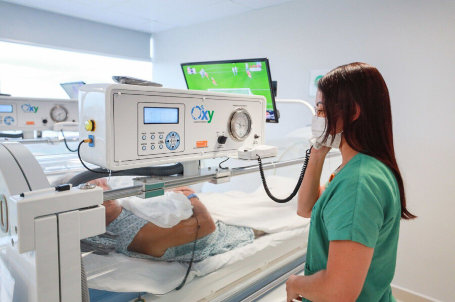 A Oxigenoterapia Hiperbárica consiste na inalação de oxigênio puro em ambiente pressurizado, com pressão superior à atmosférica. Nessas condições, ocorre um aumento significativo da quantidade de oxigênio no sangue, permitindo maior alcance aos tecidos com circulação comprometida. Desde fevereiro, mais de mil procedimentos já foram realizados no Hospital Delphina Aziz.