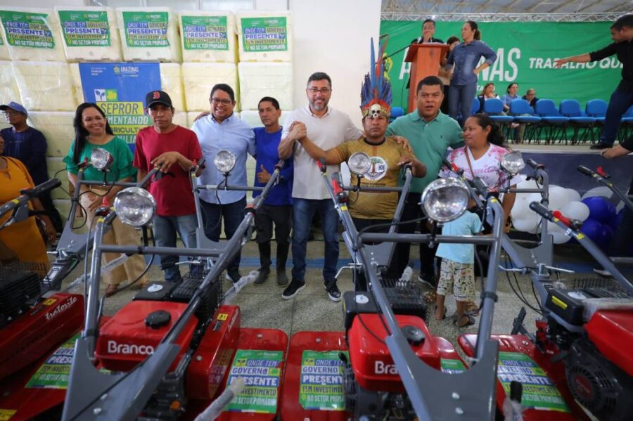 O governador também coordenou entregas voltadas à produção rural e fortalecimento da agricultura familiar. Foram entregues equipamentos como motocultivadores, mangueiras, motores, freezeres, kits roçado, mudas e cheques do Crédito Feirante.