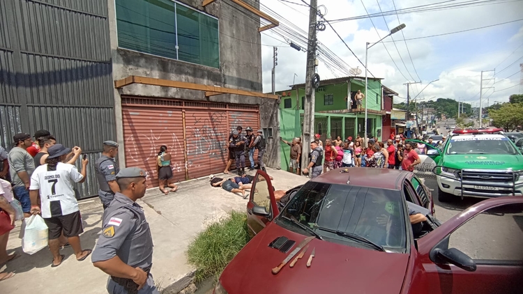 Os militares foram acionados e solicitaram apoio para iniciar a perseguição aos suspeitos que estavam em fuga em um veículo de cor vermelho, mas eles foram detidos em frente a um supermercado.