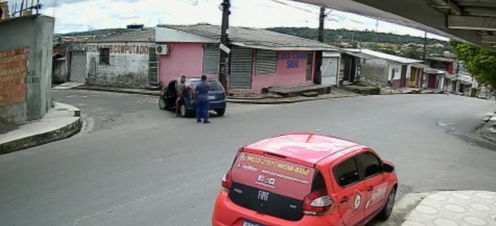 Um dos bandidos sai do veiculo e ameaça a vítima, em seguida, rouba o celular do homem. Até o momento ninguém foi preso.