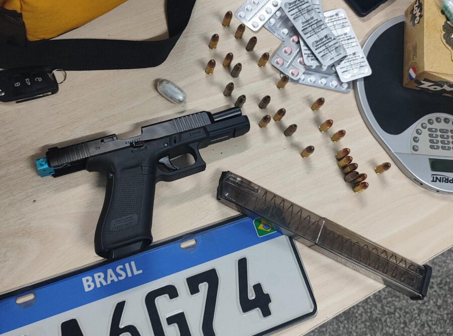 Durante a revista, os policiais encontraram com o homem uma pistola Glock G17, calibre 9 mm, municiada. Na residência, também foi localizada uma bolsa com 128 cápsulas semelhantes às usadas por “mulas” no tráfico internacional de drogas, além de cinco cartelas de Dramin, três de Diasec — medicamentos usados para disfarçar o transporte interno de entorpecentes — e duas balanças de precisão.