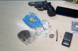 Durante a revista, os policiais encontraram com ele uma arma de fogo, porções de maconha e pedras de cocaína. Uma balança de precisão também foi apreendida, indicando que o material seria utilizado para o tráfico de drogas.