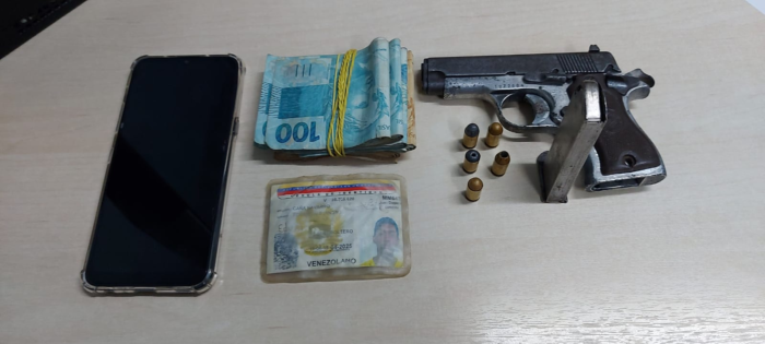 Durante a abordagem foram encontradas uma arma de fogo, cinco munições intactas e a quantia de 5.050 reais e um aparelho celular. A dupla foi conduzida ao 1° Distrito Integrado de Polícia (DIP).