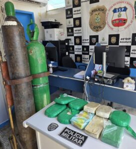 Ao ser abordado, o homem afirmou que estava se dirigindo a Manaus e que pretendia enviar como encomenda dois cilindros de oxigênio. Após verificação, os policiais identificaram que um dos cilindros continha 10 tabletes de substância semelhante à pasta base de cocaína, totalizando aproximadamente 10,35 kg, conforme a pesagem preliminar realizada pela Polícia Civil.