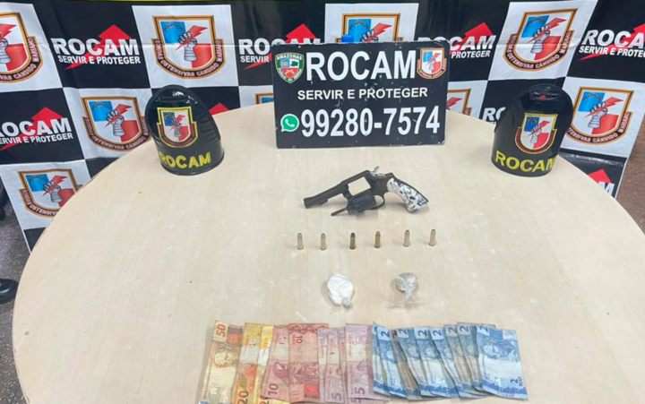 A Rocam efetuou abordagem no jovem e encontrou um revólver Indumil Cassidy 38SJ, calibre 38; seis munições do mesmo calibre, intactas; uma porção média de substância com aspecto de cocaína; R$ 148,00 referente ao comércio da droga, e uma porção de entorpecente com aspecto de pedra oxi.