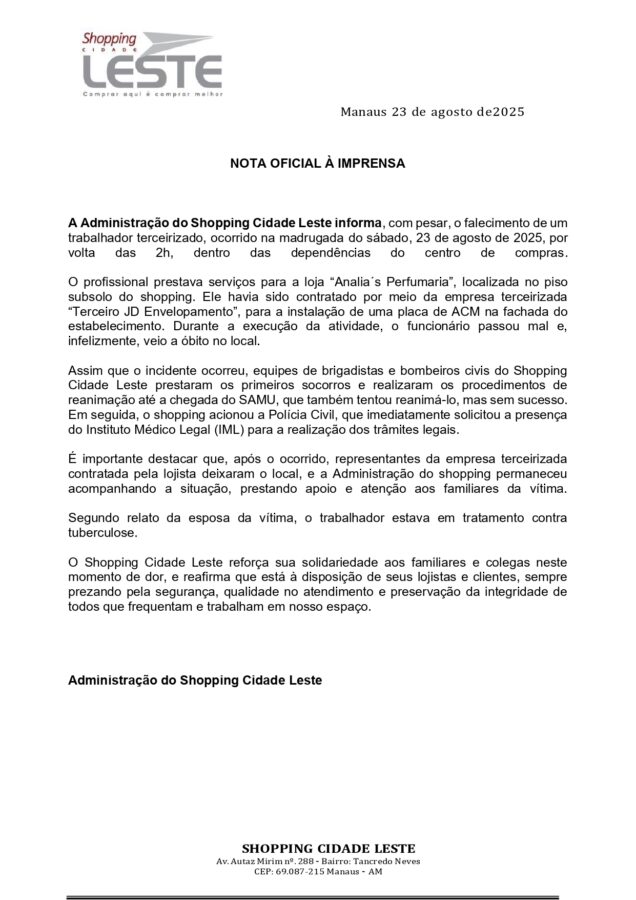 O Shopping Cidade Leste lamentou a morte do trabalhador e se colocou a disposição da família e dos lojistas nesse momento.