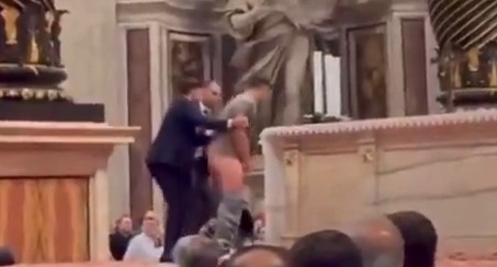 Durante uma cerimônia no local, o homem subiu as escadas e já retirando sua calça, resolveu urinar no altar onde o Papa costuma celebrar grandes missas.
