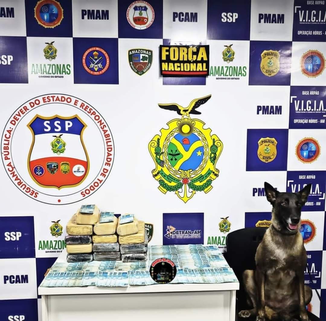 Manaus-Durante a operação Hórus/VIGIA/Base Arpão I, o efetivo de serviço abordou a embarcação F/B GM Oliveira II , com destino a Manaus, e durante a revista na embarcação, a cadela policial JADE localizou no convés principal, dentro de uma caixa de papelão: 07 tabletes de cocaína, 03 tabletes de skank e 03 tabletes de pasta base cocaína. Tal caixa foi despachada no município de Tonantins, que teria sido encaminhada por um nacional G.S.S. Dando continuidade a revista, ainda foram localizados R$ 10.000,00, dentro de uma caixa da descarga do banheiro. O material e o conferente do convés foram conduzidos a base arpão para procedimentos.
