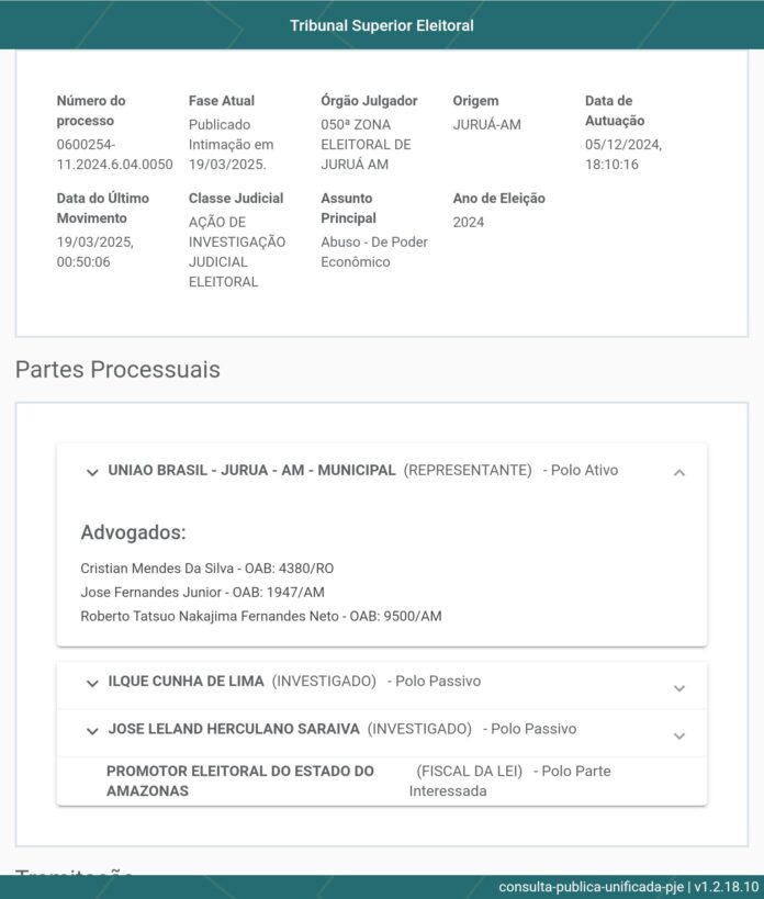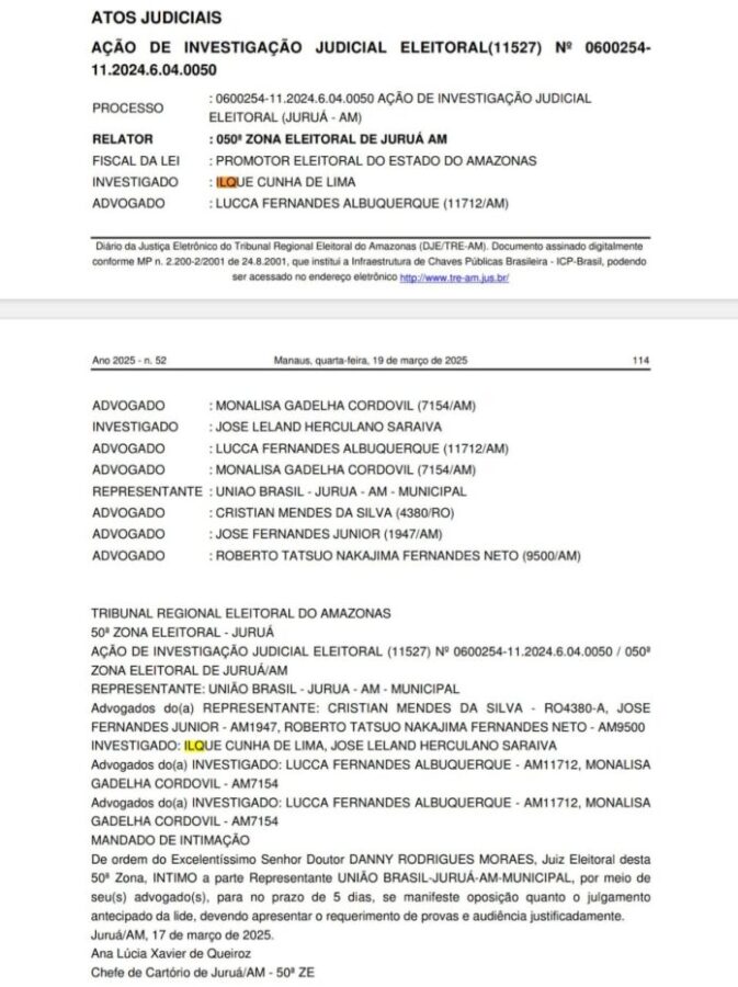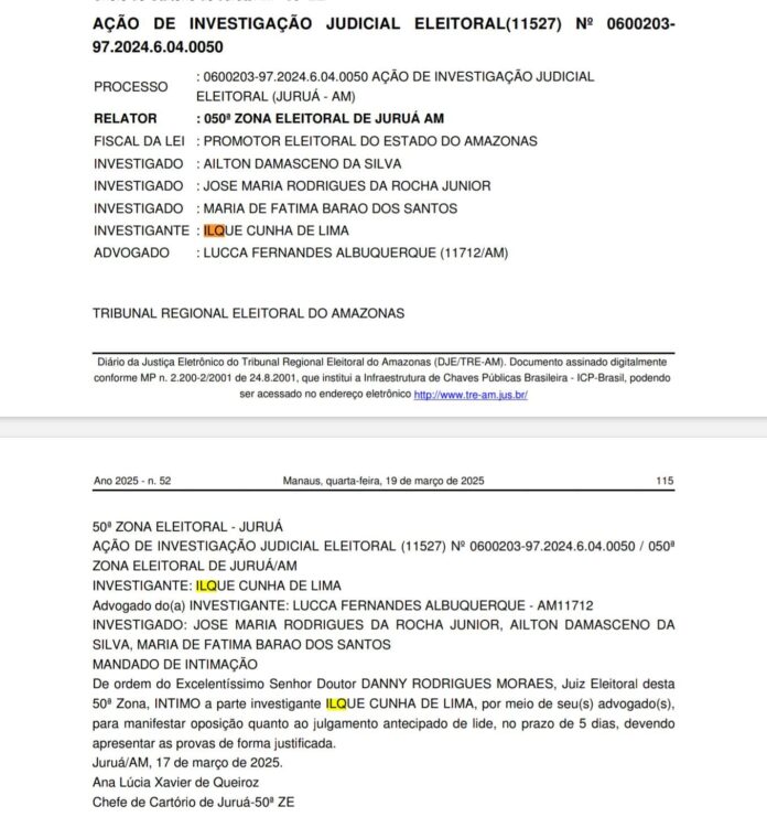 Uma Ação de Investigação Judicial Eleitoral (AIJE), foi protocolada na 050ª Zona Eleitoral de Juruá, onde o juiz eleitoral Danny Rodrigues Moraes, determinou aos envolvidos a apresentação de provas e a apresentação de defesa por parte de Ilque Cunha, num prazo de cinco dias.