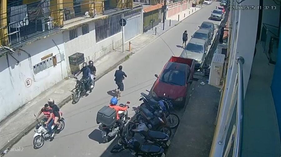 Nas imagens, o atirador aparece saindo às pressas da loja logo após efetuar os disparos, correndo em direção à rua, onde um comparsa o aguardava em uma motocicleta para auxiliar na fuga. O vídeo mostra o criminoso em aparente estado de desespero enquanto tenta escapar rapidamente do local do crime.