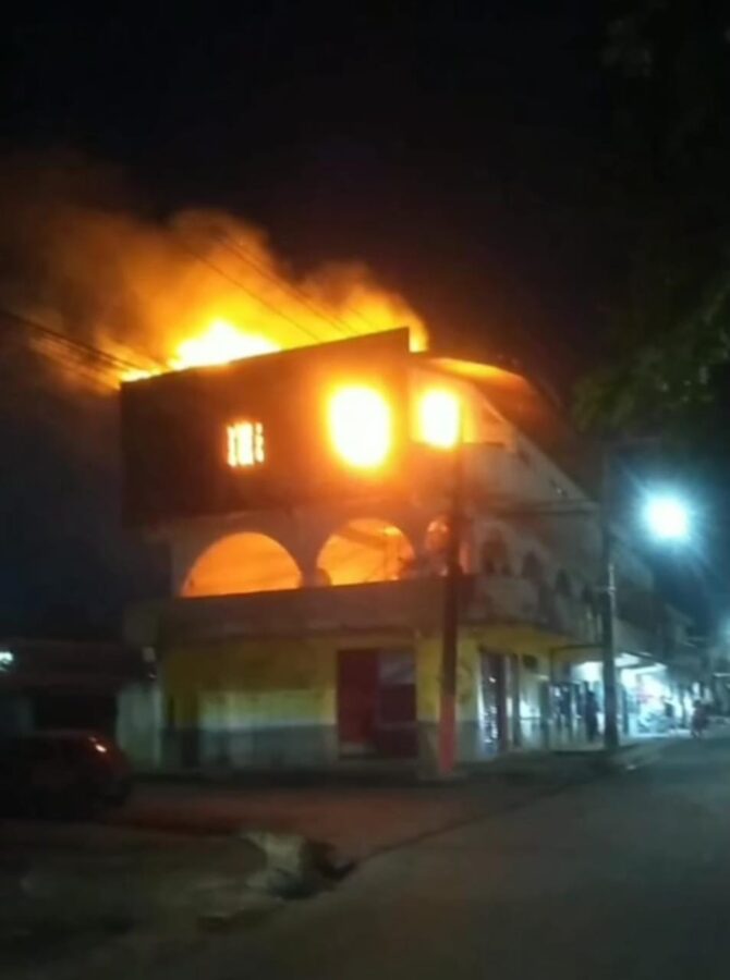 Uma casa foi tomada pelo fogo na noite desta quinta-feira (26/06), na rua 11, no bairro Alvorada 3. Imagens registradas por moradores mostram chamas intensas consumindo o segundo andar de um imóvel localizado em uma esquina da via.