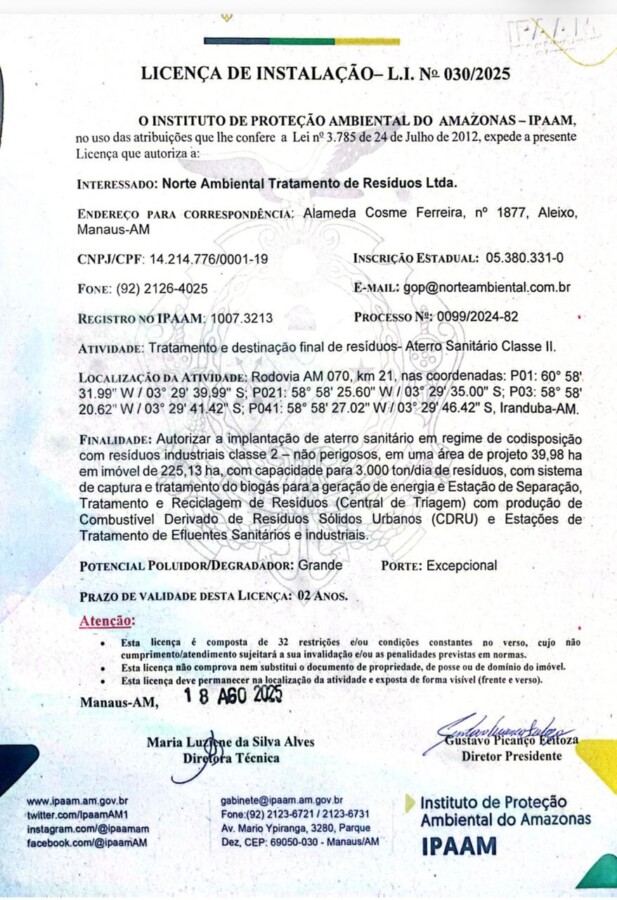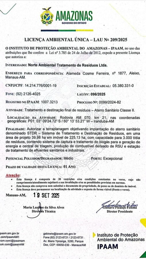 A liberação das licenças pelo Ipaam para a execução do Parque de Soluções Ambientais reforça que o projeto atende às exigências técnicas e legais de proteção ambiental no Amazonas, conforme previsto na legislação estadual.