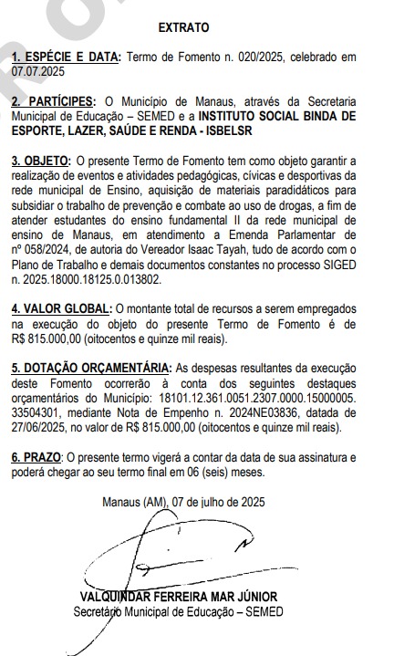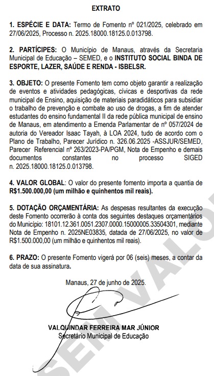 A Prefeitura de Manaus pagou mais de R$ 3,5 milhões para em emendas parlamentares para um instituto social criado em 2009, para atender demandas da Secretaria Municipal de Educação (Semed), por seis meses.