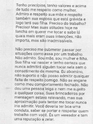 Em resposta aos assédios sofridos, a servidora pediu demissão. “Tenho princípios, tenho valores, e acima de tudo, me respeito como mulher. Admiro e respeito sua mãe e sua esposa que está grávida e logo terá sua filha. Preciso do trabalho? Preciso” Mas suas atitudes hoje na lancha em querer me tocar e sabe lá quais mais eram suas intenções, não importa, mas são inadmissíveis”, dispara Kamila em uma mensagem ao agressor, comunicando seu desligamento.