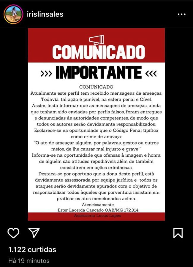 “ Atuamente este perfil tem recebido mensagens de ameaças. Todavia tal ação é crime e tem punição, na esfera criminal e Civil” no comunicado, notasse que ela tem sofrido importuno, ofensas de palavras de baixo calão, e até ameaça de violência física ou de morte.