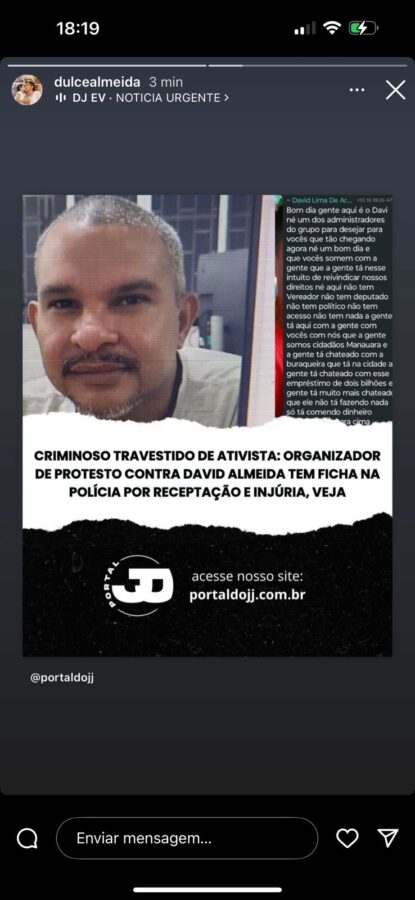 Dulce Almeida, irmã do prefeito David Almeida (Avante), está em uma campanha sórdida para desacreditar pessoas ligadas ao movimento #ForaDavid, que pede o impeachment do gestor municipal.