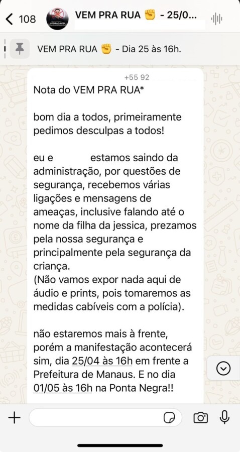 Duas jovens responsáveis por organizar os grupos de mensagens por aplicativo e redes sociais, foram ameaçadas por telefone e por mensagens e por medo, deixaram o movimento.