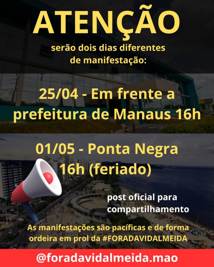 As manifestações estão previstas para está sexta-feira (25) em frente a sede da Prefeitura de Manaus, e dia 1° de maio, dia do trabalhador no calçadão da Ponta Negra.