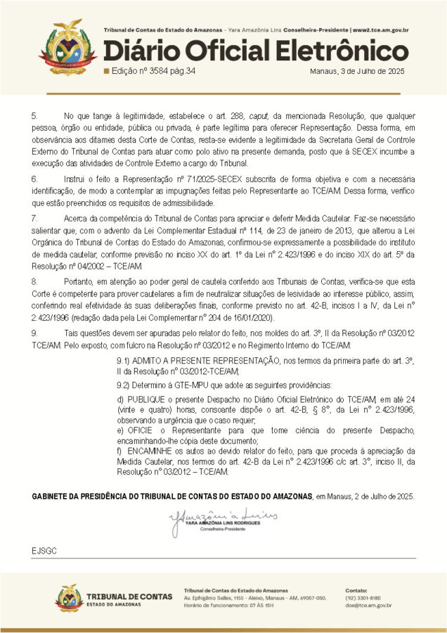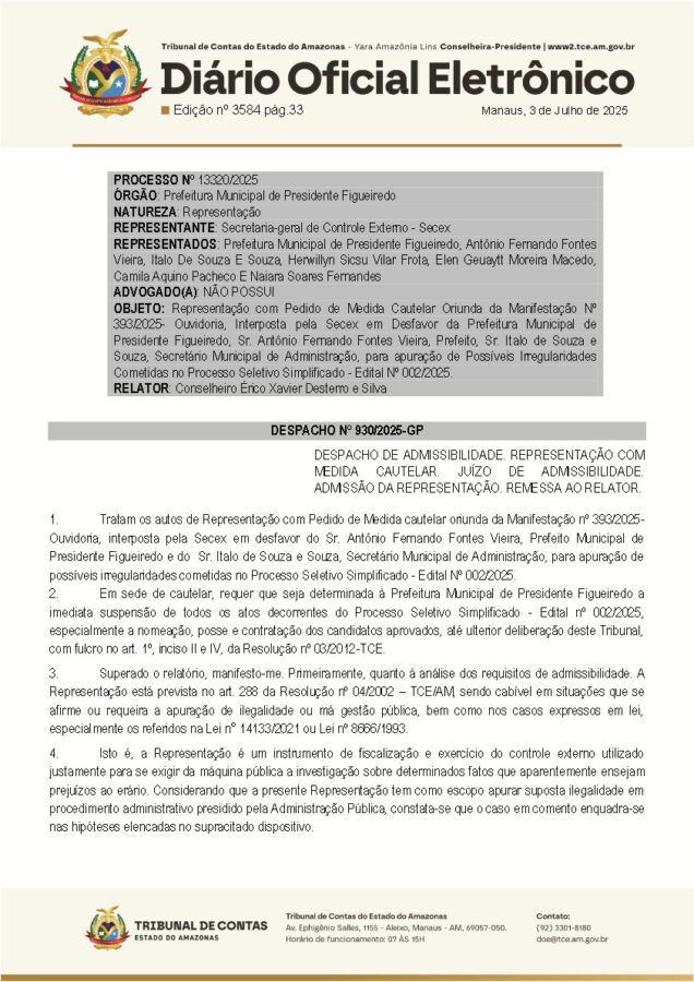 Um pedido de representação com medida cautelar foi aceito pelo Tribunal de Contas do Estado do Amazonas (TCE-AM), contra o prefeito Antônio Fernando Fontes Vieira, mais conhecido como “Fernandão” (PL), e a prefeitura de Presidente Figueiredo, por conta de irregularidades em um Processo Seletivo Simplificado (PSS).