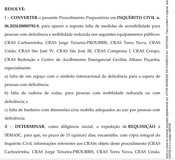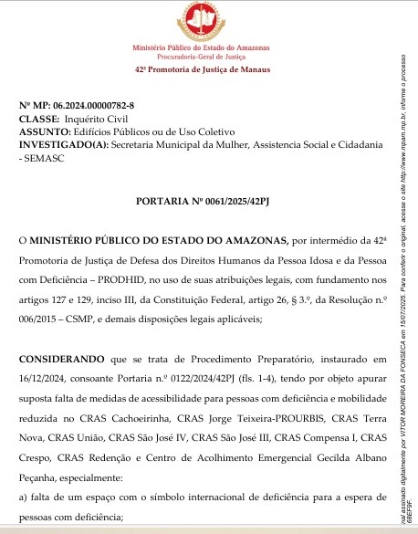 A 42ª Promotoria de Justiça dos Direitos da Pessoa Idosa e da Pessoa com Deficiência (Prodhid), do Ministério Público do Amazonas (MP-AM), abriu um inquérito civil público, para investigar a falta de acessibilidade de pessoas com deficiência e mobilidade reduzida em prédios da Prefeitura de Manaus.