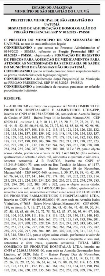 Ao todo, o contrato firmado entre as quatro empresas e a Prefeitura de São Sebastião do Uatumã, chega a um total de R$ 9.386.404,00 (nove milhões, trezentos e oitenta e seis mil, quatrocentos e quatro reais), em medicamentos.