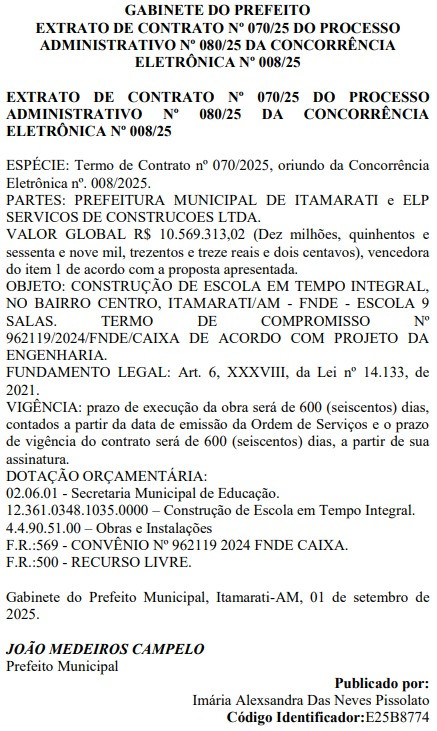 De acordo com o documento, a empresa contratada é a ELP SERVIÇOS DE CONSTRUÇÕES LTDA, com sede em Manaus, que receberá o valor total de R$ 10.569.313,02 (dez milhões, quinhentos e sessenta e nove mil, trezentos e treze reais e dois centavos), da Prefeitura de Itamarati.