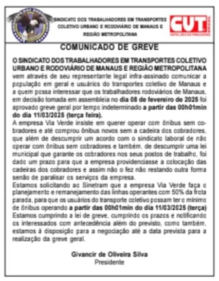 O Sindicato dos Trabalhadores Rodoviários de Manaus divulgou neste domingo (9), um comunicado de greve geral para motoristas e cobradores da empresa Via Verde Transportes, para esta terça-feira (11).