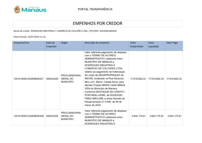De acordo com informações, a desapropriação do terreno na zona Norte da capital, ocorreu para à construção de casa populares por meio do Programa Minha Casa Minha Vida, do Governo Federal, e a Prefeitura de Manaus teria pago a RODRIGUES INDÚSTRIA E COMÉRCIO DE COLCHÕES LTDA o valor total de R$ 21.510.279,71 (vinte e um milhões, quinhentos e dez mil, duzentos e setenta e nove reais e setenta e um centavos) pelo local.