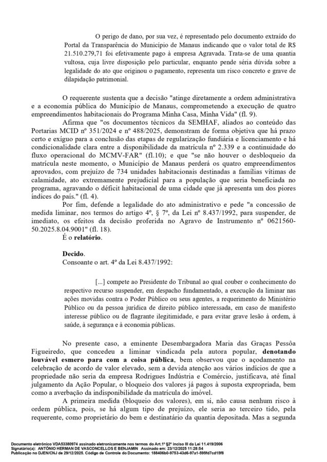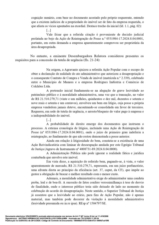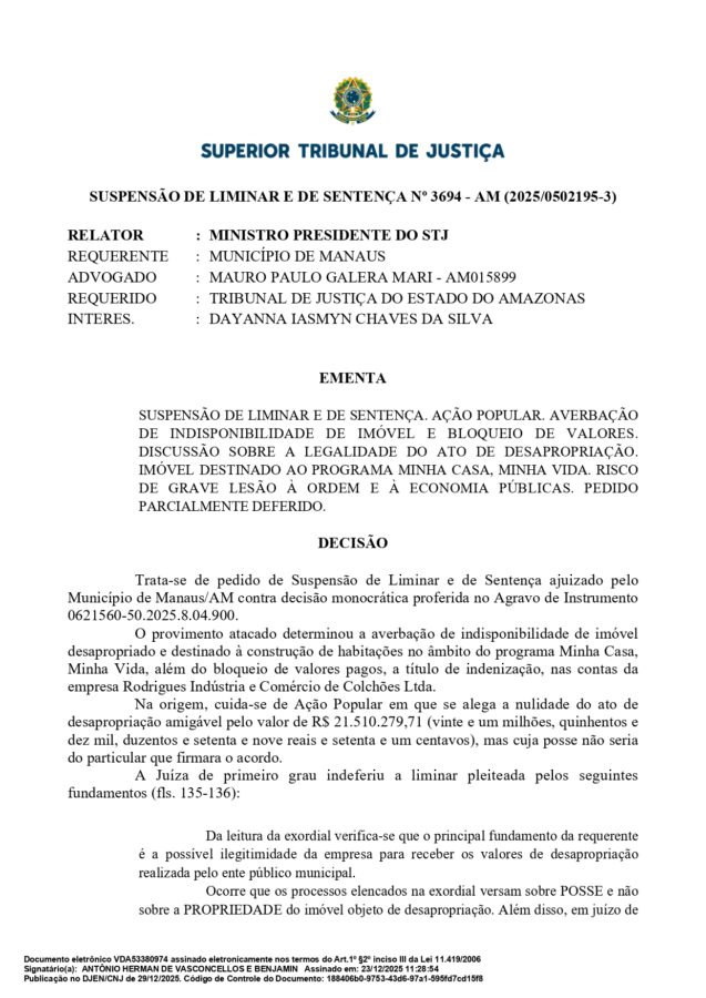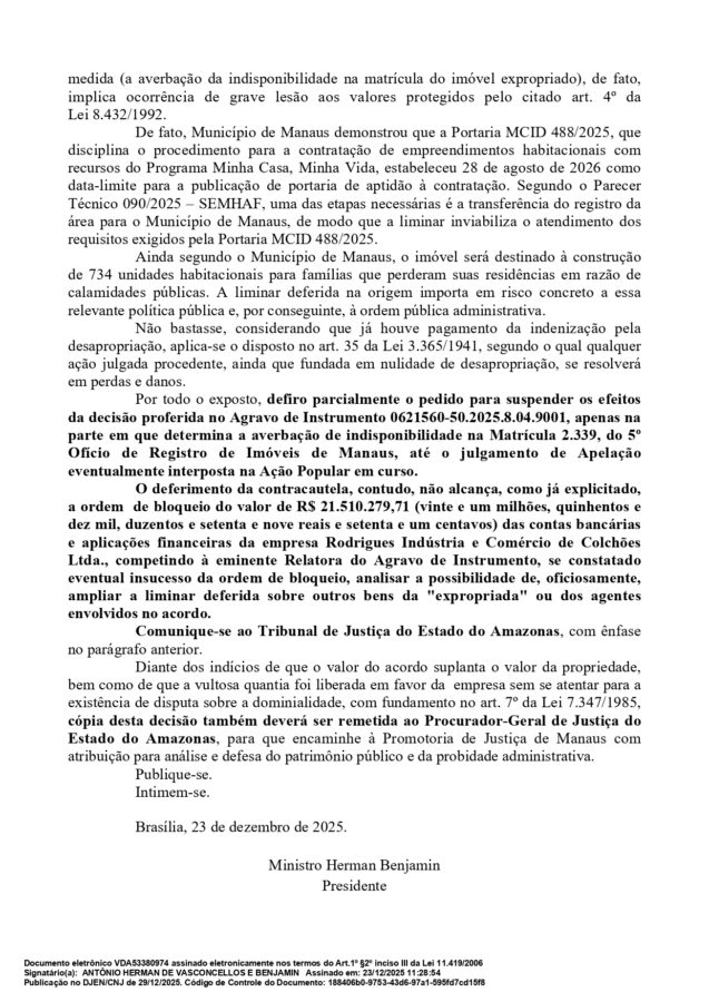 Na decisão, o ministro Herman Benjamin considerou que há elementos que indicam que o valor pago pelo município de Manaus, supera o valor real do imóvel, além do pagamento não ter sido feito de disputa judicial.