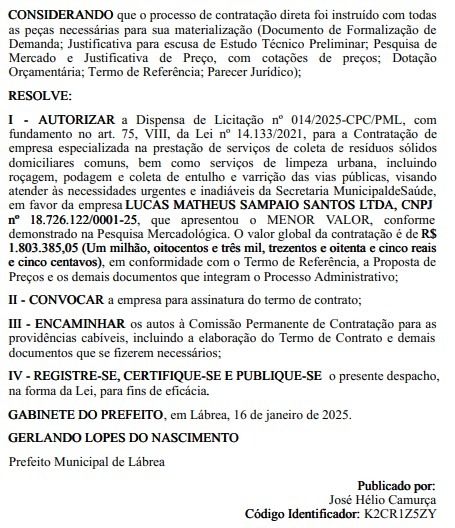 De acordo com o Diário Oficial dos Municípios (DOM), Gerlando contratou a empresa LUCAS MATHEUS SAMPAIO SANTOS LTDA, pelo valor total de R$ 1.803.385,05 (um milhão, oitocentos e três mil, trezentos e oitenta e cinco reais e cinco centavos), por meio de Dispensa de Licitação, devido ao estado de emergência administrativa declarado em Lábrea.