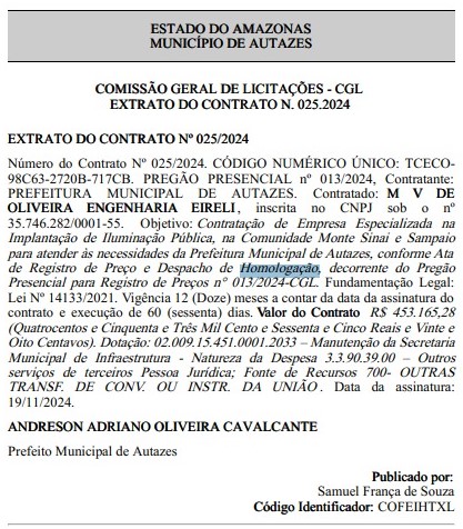 A obra seria de implantação de iluminação pública, mas o contrato deve ser anulado pelo Tribunal de Contas do Estado do Amazonas (TCE-AM), devido a já proibição do parte do órgão, a assinatura de contratos por parte de Andreson Cavalcante em Autazes.
