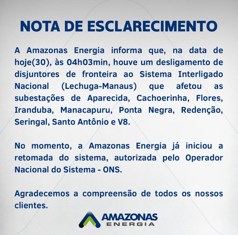 Segundo informações da concessionária Amazonas Energia, o desligamento ocorreu por volta das 4h30 da madrugada, tendo seu restabelecimento total iniciando as 7h da manhã.