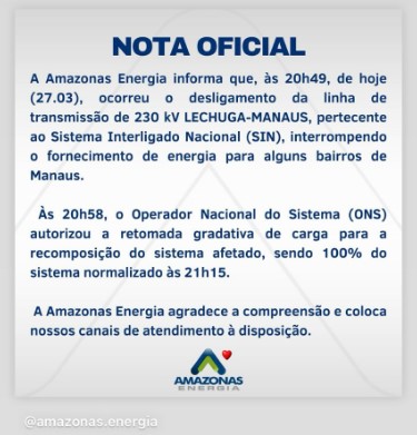 “A Amazonas Energia informa que, às 20h49, de hoje (27.03), ocorreu o desligamento da linha de transmissão de 230 kV LECHUGA-MANAUS, pertencente ao Sistema Interligado Nacional (SIN), interrompendo o fornecimento de energia para alguns bairros de Manaus.