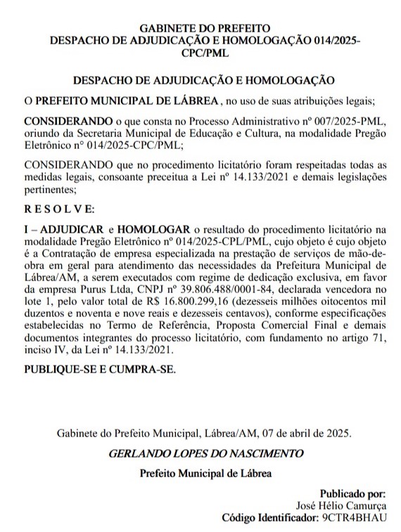 Segundo documentos homologado no Diário Oficial dos Municípios (DOM) desta terça-feira (8), Gerlando contratou a empresa PURUS LTDA, pelo valor total de R$ 16.800.299,16 (dezesseis milhões, oitocentos mi, duzentos e noventa e nove reais e dezesseis centavos), para a contratação de mão-de-obra geral para atender a Secretaria Municipal de Educação e Cultura.