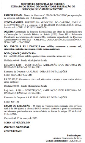Segundo publicação do Diário Oficial dos Municípios (DOM), Mara Alves contratou a empresa E B BRAULIO CONSTRUÇÕES LTDA, para a construção, reforma e ampliação de uma UBS no município, pelo valor de R$ 1.670.879,25 (um milhão, seiscentos e setenta mi e setenta mil, oitocentos e setenta e nove reais e vinte e cinco centavos), mas posteriormente ratificou o valor em R$ 205.879,25 (duzentos e cinco mil, oitocentos e setenta e nove reais e vinte e cinco centavos), ficando a obra no valor final de R$ 1.465.000,00(um milhão, quatrocentos e sessenta e cinco mil reais).