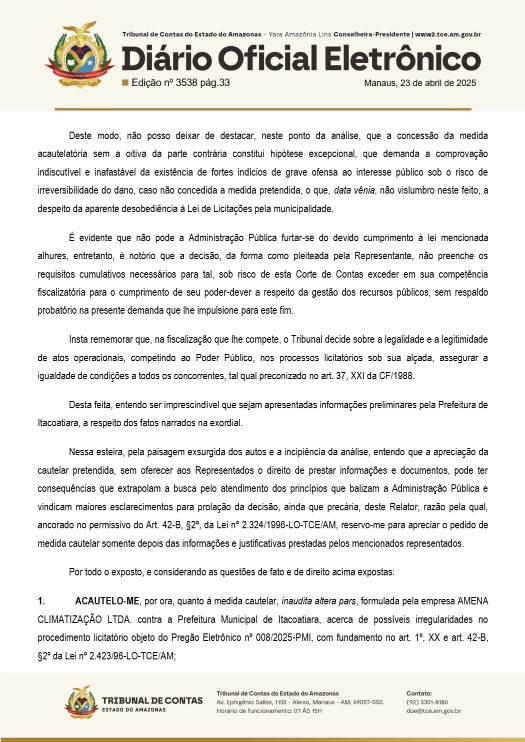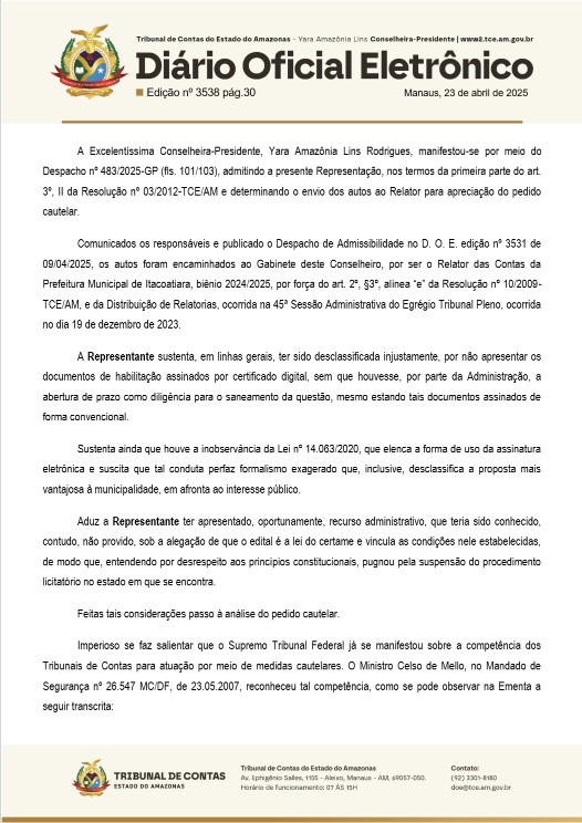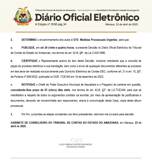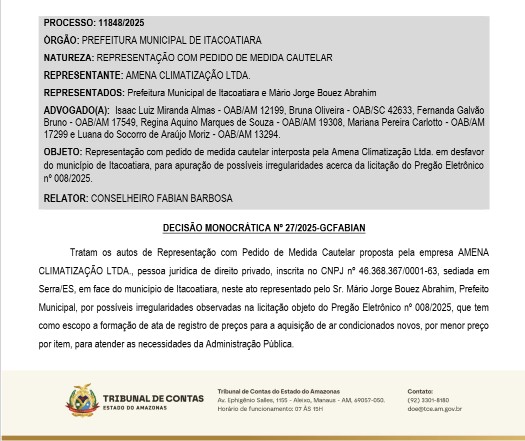 O pedido de representação com medida cautelar, aponta que uma empresa foi desclassificada de maneira irregular, porque a Prefeitura de Itacoatiara não abriu um prazo de correção de falhas.