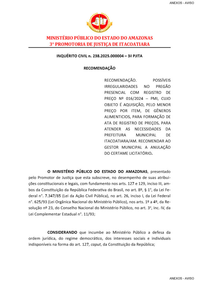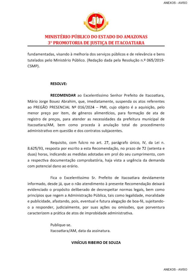 Supostas irregularidades em uma licitação na compra de gêneros alimentícios no município de Itacoatiara, serão investigados pelo Ministério Público do Amazonas (MP-AM), após identificar um suposto favorecimento a uma empresa ligada ao prefeito Mário Abrahim (Republicanos).