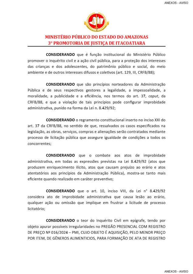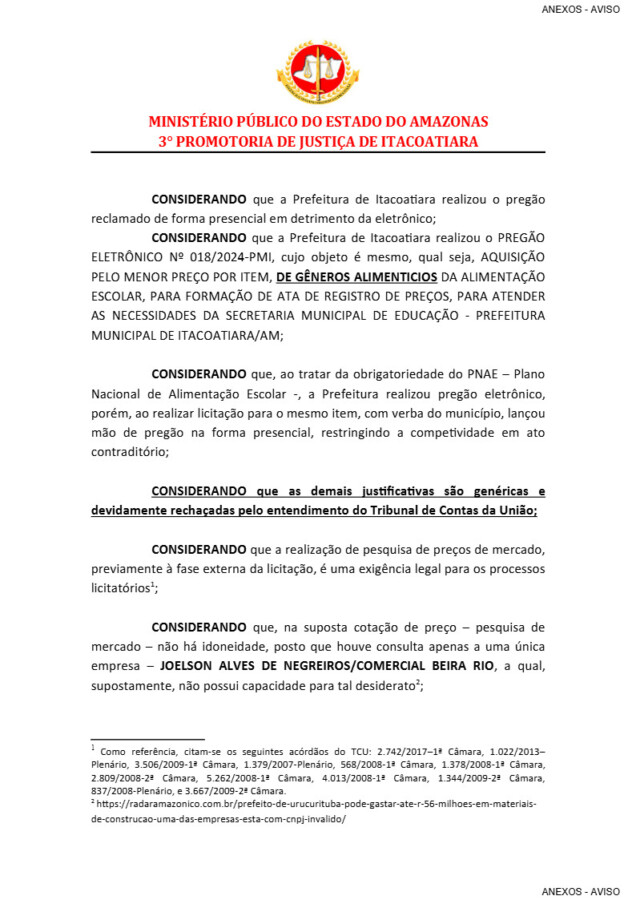 Segundo a denúncia apresentada ao MP-AM, a Prefeitura de Itacoatiara no momento do ato de cotação de preço e pesquisa de mercado, não teriam cumprido os princípios de idoneidade, já que houve uma consulta de preços, apenas na empresa JOELSON ALVES DE NEGREIROS/COMERCIAL BEIRA RIO LTDA, no PREGÃO PRESENCIAL Nº 016/2024 – PMI.
