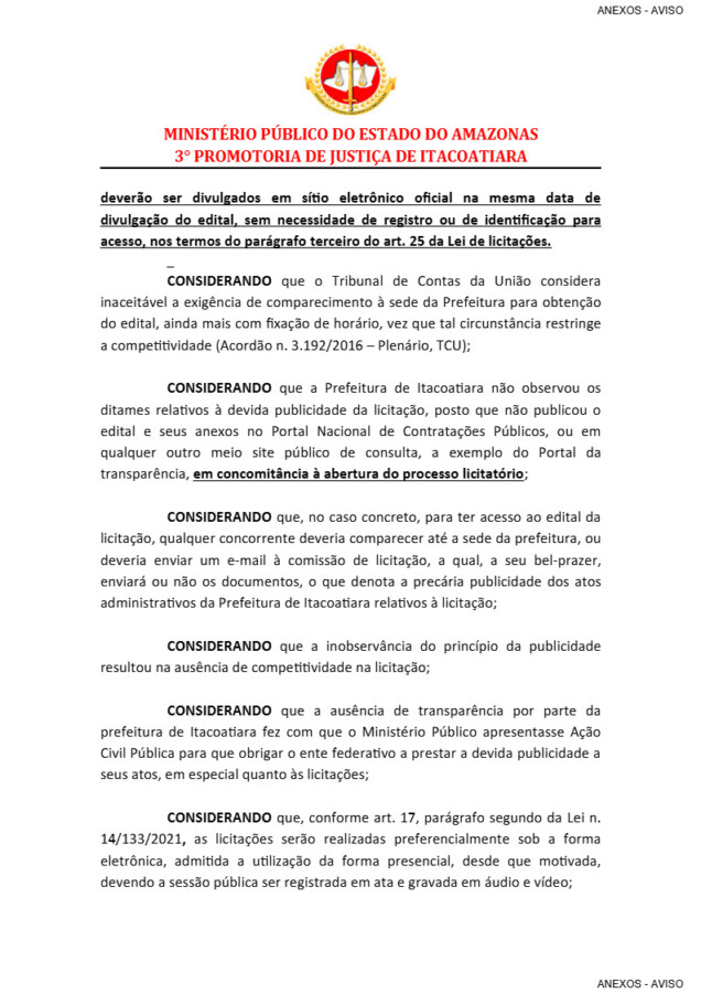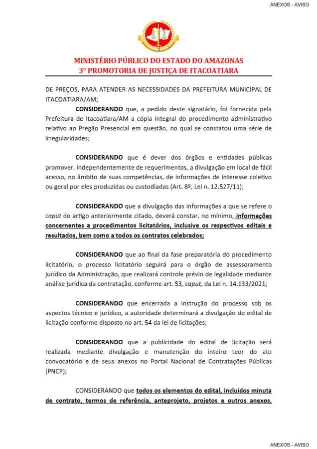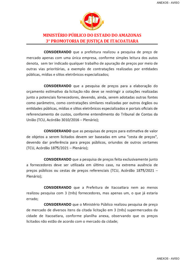 De acordo com o promotor de justiça Vinicius Ribeiro, “A Prefeitura de Itacoatiara nem ao menos realizou pesquisa com 3 (três) fornecedores, mas apenas um, o que já estaria errado”.