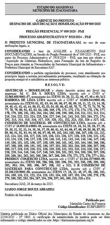 De acordo com o Diário Oficial dos Municípios (DOM) desta terça-feira (22), o prefeito de Itacoatiara Mário Abrahim, contratou três empresas para o fornecimento de material hidráulico e caixas d’água, para serviços no município.