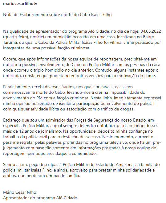 “Hoje é um dia muito triste para nós policiais militares, perdemos um irmão de farda, mas eu quero dizer de antemão aos senhores que eu tenho o maior respeito pela TV A Crítica, mas no programa de hoje, Alô Cidade, o repórter Mário Cesar Filho praticamente julgou e condenou o meu irmão de farda cabo Isaías Filho”, afirmou em vídeo o sargento Igor Silva, presidente da APPBMAM.