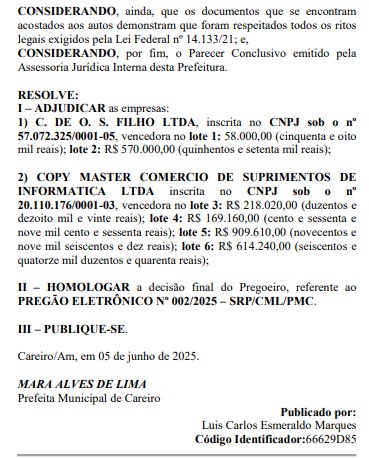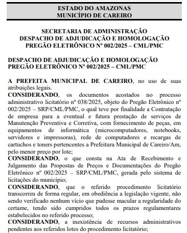 De acordo com publicação no Diário Oficial dos Municípios (DOM) desta sexta-feira (6), a prefeita Mara Alves vai contratar duas empresas para “eventual e futura prestação de serviços de Manutenção Preventiva e Corretiva, com fornecimento de peças, em equipamentos de informática (microcomputadores, notebooks, servidores e impressoras), rede de computadores e recargas de cartuchos e toners pertencentes a Prefeitura Municipal de Careiro”.
