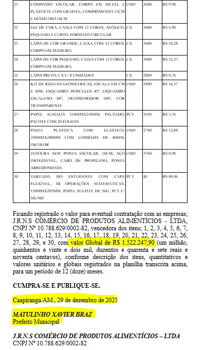 De acordo com o Diário Oficial dos Municípios (DOM), Matulinho contratou, novamente, a empresa J.R.N.S. COMÉRCIO DE PRODUTOS ALIMENTÍCIOS LTDA, pelo valor total de R$ 1.522.247,90 (um milhão, quinhentos e vinte e dois mil, duzentos e quarenta e sete reais e noventa centavos).