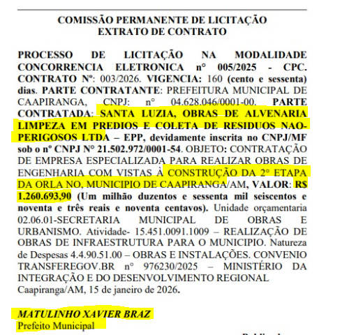 O prefeito de Caapiranga Matulinho Braz (UB), contratou uma empresa de coleta de resíduos para construir mais uma etapa da orla do município por mais de R$ 1 milhão de reais.