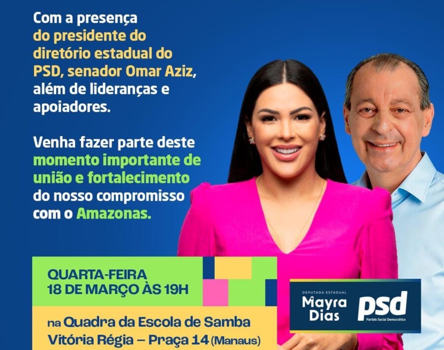 A deputada estadual Mayra Dias realiza nesta quarta-feira (18), às 19h, o ato oficial de filiação ao Partido Social Democrático (PSD), em Manaus. O evento acontece na quadra da Escola de Samba Vitória-Régia, no bairro Praça 14 de Janeiro, e deve reunir lideranças políticas, apoiadores e militantes.