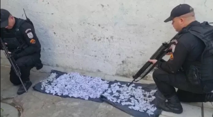Junto dele, os policiais encontraram uma grande quantidade de material entorpecente e um simulacro de pistola. Foram apreendidos 170 pinos de cocaína; 59 trouxas de maconha; 780 pedras de crack.
