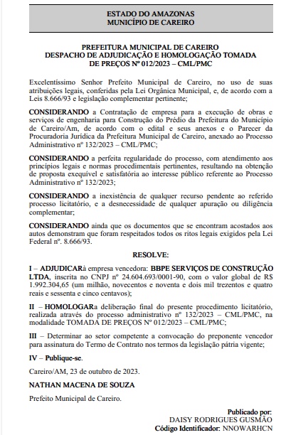 A empresa contemplada BBPE SERVIÇOS DE CONSTRUÇÃO LTDA, vai receber R$ 1.992.304,65 (um milhão, novecentos e noventa e dois mil, trezentos e quatro reais e sessenta e cinco centavos), para construir uma nova sede para a prefeitura do Careiro Castanho.