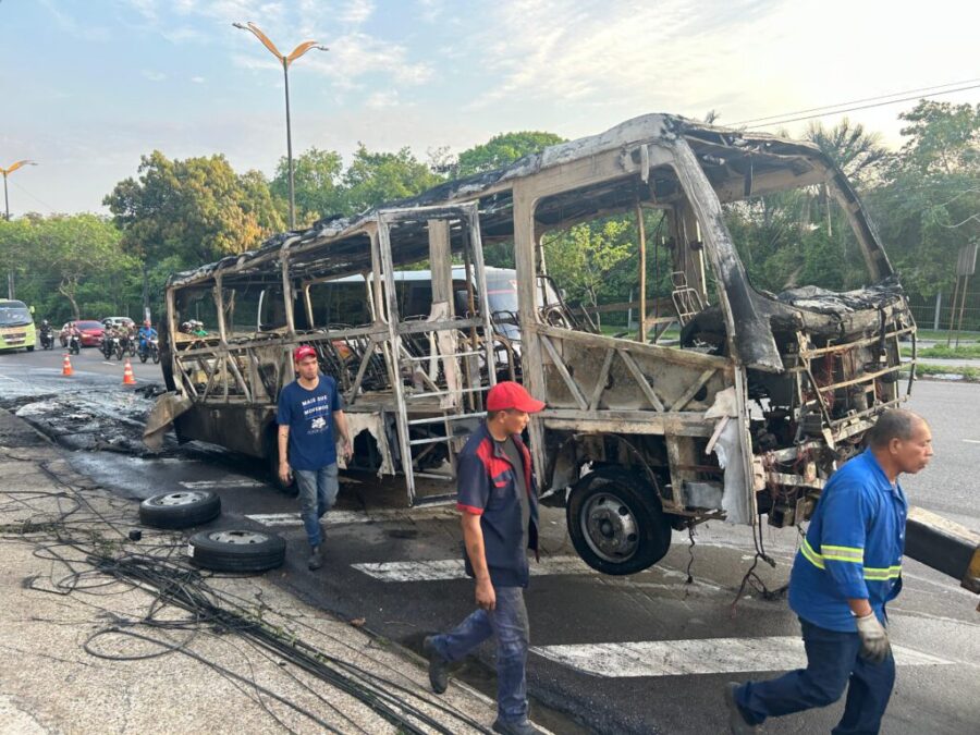 Micro-ônibus que faz rota para o Distrito é consumido pelo fogo em Manaus